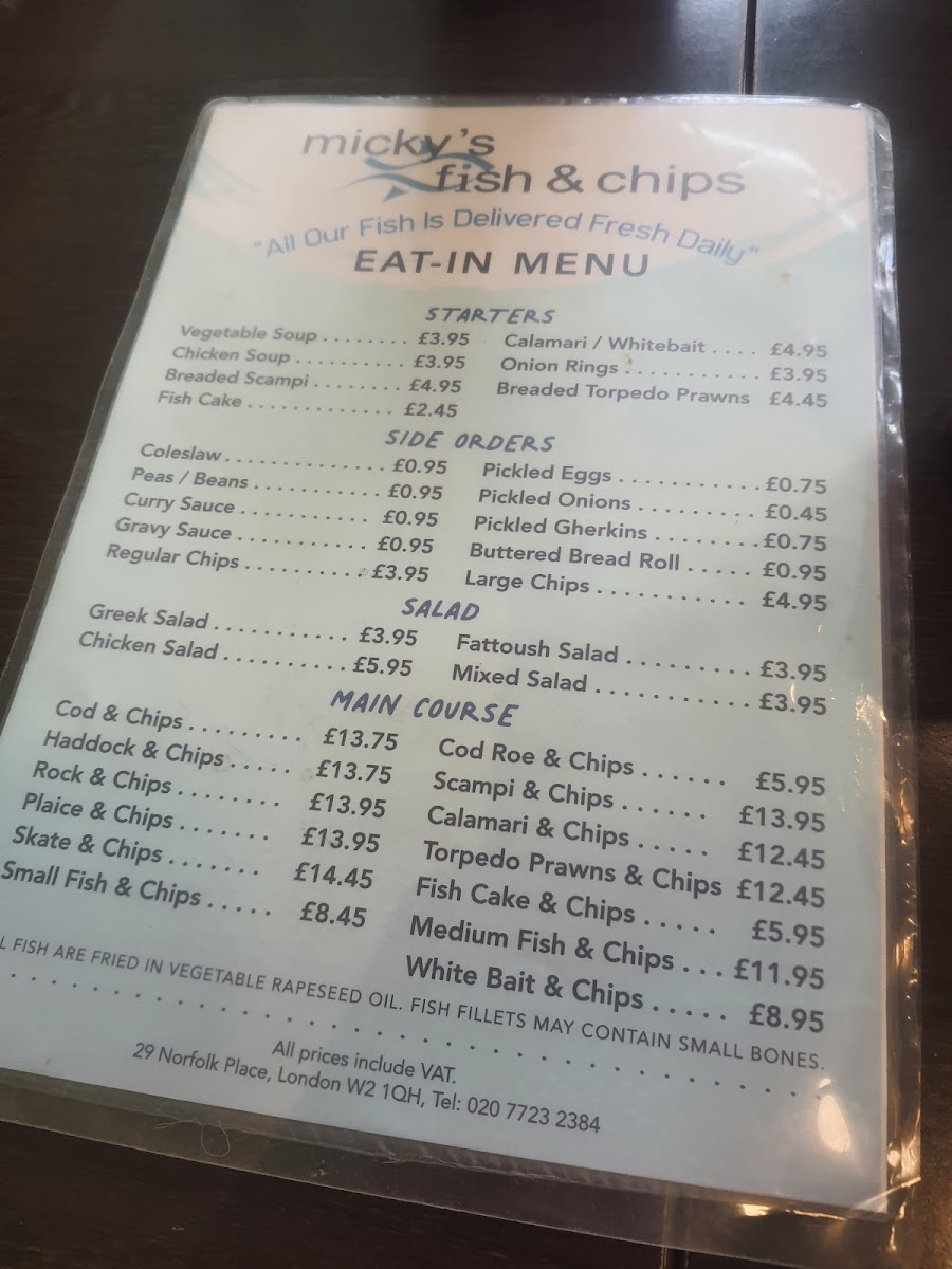 At Micks Chips on 78 Manor Rd, Lancing, the menu offers a straightforward yet satisfying selection that caters well to classic fish and chip cravings. Starters like Vegetable Soup, Chicken Soup, Breaded Scampi, Calamari, and Onion Rings provide a light yet flavorful beginning to the meal. For those seeking accompaniments, the Side Orders such as Coleslaw, Peas, Curry Sauce, Gravy Sauce, and Regular Chips allow diners to customize their plates, while the Salad options-including Greek Salad, Chicken Salad, Fattoush Salad, and Mixed Salad-offer fresher, lighter alternatives. The main course remains the highlight, featuring a range of classic choices from Cod & Chips and Cod Roe & Chips to Scampi & Chips, Haddock & Chips, and Rock & Chips, all promising generous portions and traditional preparation. Overall, the menu balances familiar favorites with a few lighter options, providing something for both comfort-food lovers and those seeking a more varied plate.